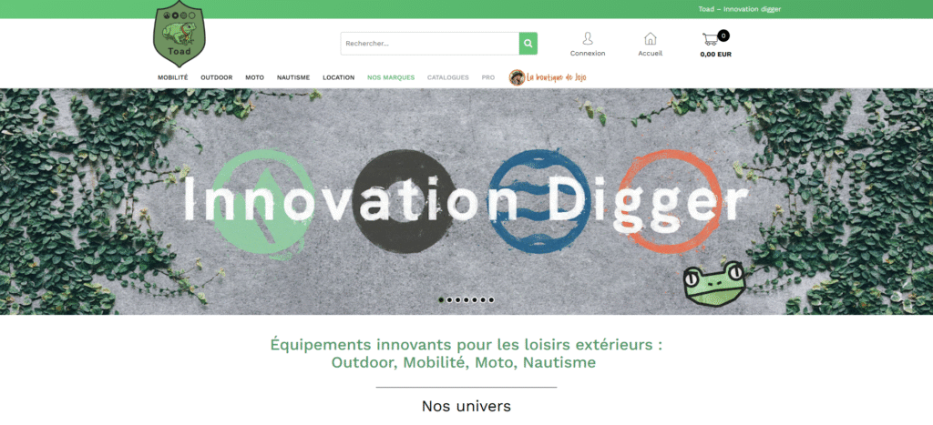Fondée par Denis CARRON de la CARRIÈRE, l’entreprise bretonne située à Pluguffan est née en 2012 avec la volonté de devenir LE spécialiste des produits innovants dans les loisirs d’extérieurs. Rapidement, l’enseigne au crapaud a étendu son influence dans toute la France grâce à 4 marchés principaux que sont l’outdoor (tente, barbecue nomade, sac de randonnée…), la moto (UBCO tout-terrain), le nautisme (kayak modulable) et la mobilité douce (sac de transport, vélo électrique…).