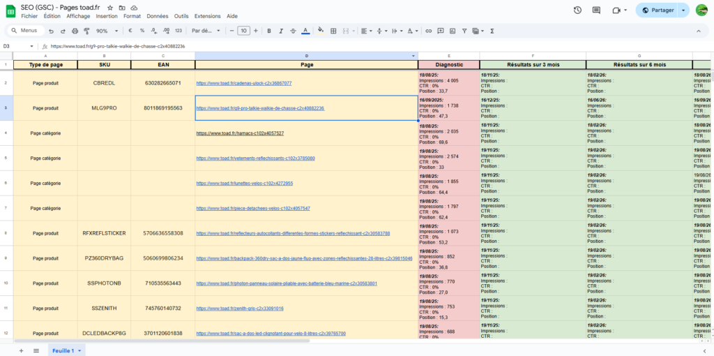 La première étape a été de faire un diagnostic des « pires » pages en matière de référencement. Pour m’aider, j’ai installé, configuré et exploité le logiciel Google Search Console (GSC). Ce dernier m’a permis de hiérarchiser le traitement des pages du site internet. Une fois cela fait, j’ai réalisé un fichier Excel (Google Sheet) afin de visualiser l’avancée de mes travaux (cf image ci-dessous). Le processus était le suivant :